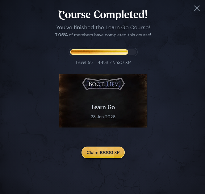 After the C course I was happy to start with Go. And after finishing the introduction Course "Learn Go" I must say that I really like Go. It does feel simple like Python but it does feel more fleshed out as a "Programming" Language. Cant wait to finish all the remaining courses and create my own Projects!
