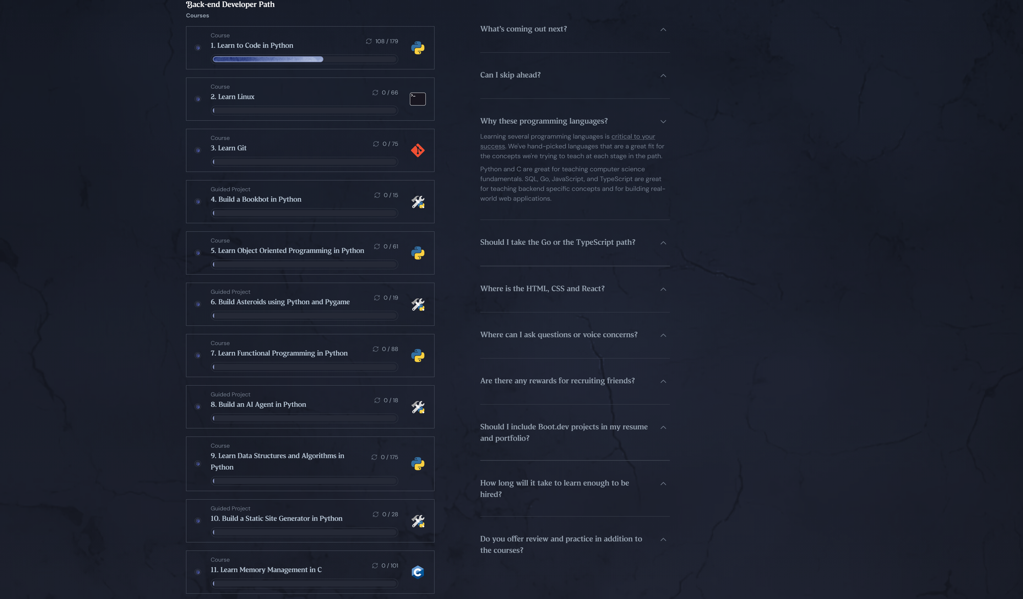 For that reason I have started the boot.dev training course. It features many different courses in python, go, typescript, javascript and c.